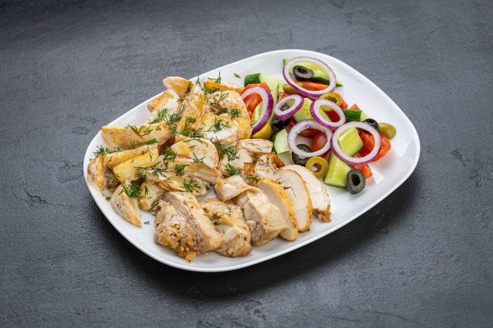 Куряче стегно запечене, салат овочевий, картопля по-уланівськи з вершками, хліб.